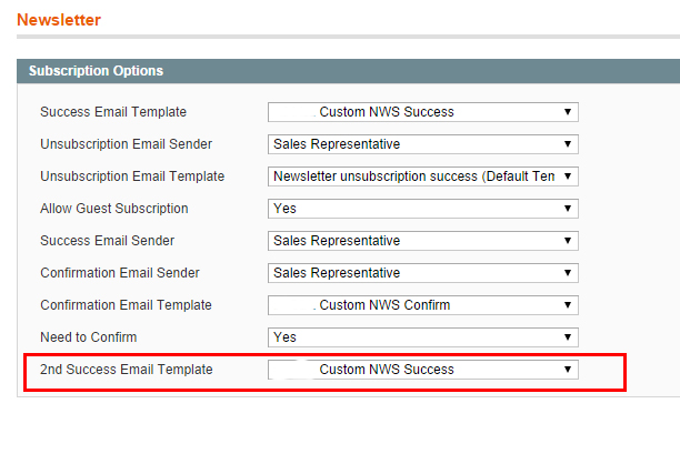 你可以看到,它使用了一个下拉部分。这允许我们只为成功邮件设置一个电子邮件模板。因此,您需要将此部分更改为multiselct,以便您可以选择多个成功的电子邮件模板。你又需要重新编写Mage_Newsletter的Subscriber ,以一次发送多个邮件模型类。
