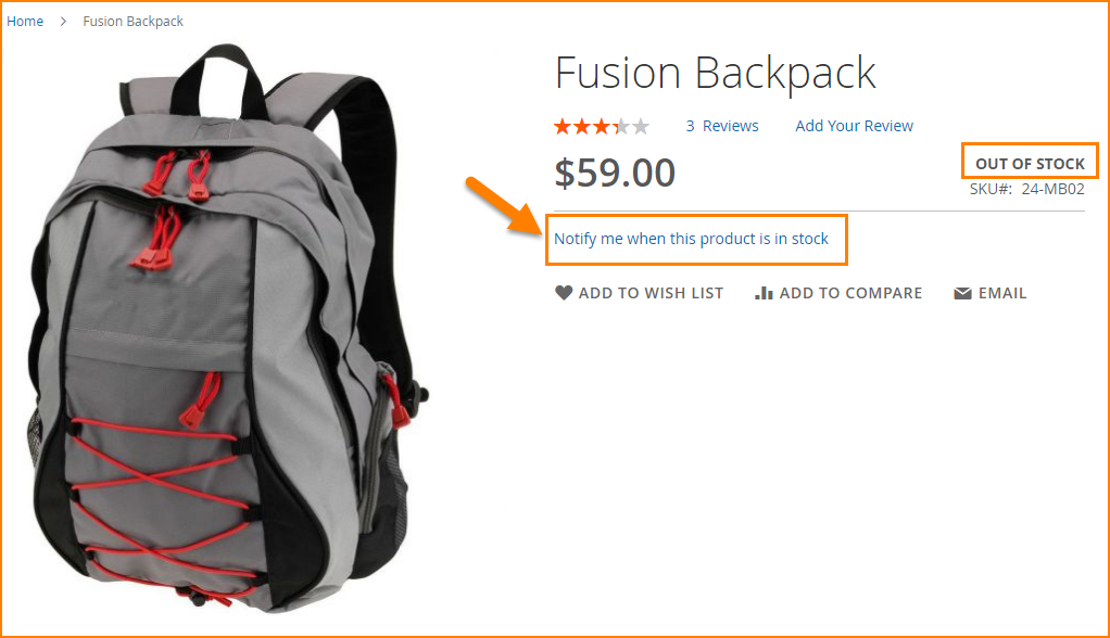 这些设置将为每个缺货产品创建一个链接“此产品有库存时通知我”。客户可以点击链接订阅提醒,以便在产品有货时自动收到电子邮件通知。