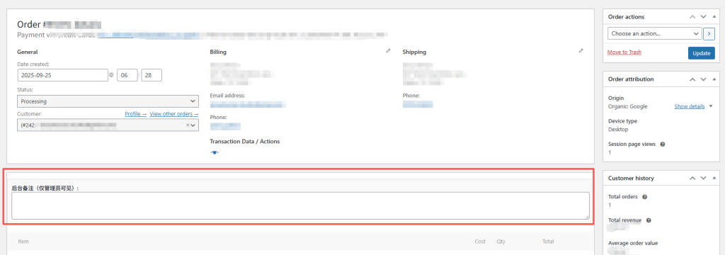订单详情页:在「产品 item 模块」的最上方(整个 item 列表之前)加一个「后台备注」输入框(一个订单只有一个备注,不是每个商品)。