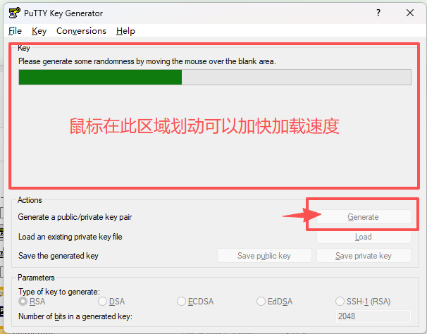 下载完后,先打开Puttygen.exe文件,打开后,点击Generate,然后使用鼠标在加载条下面划动就可以快速加载