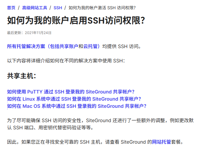 如何在siteground链接SSH,其实在官方的文档中已经有说明