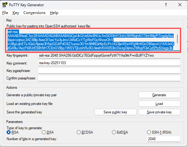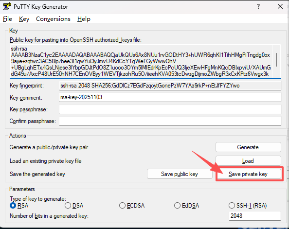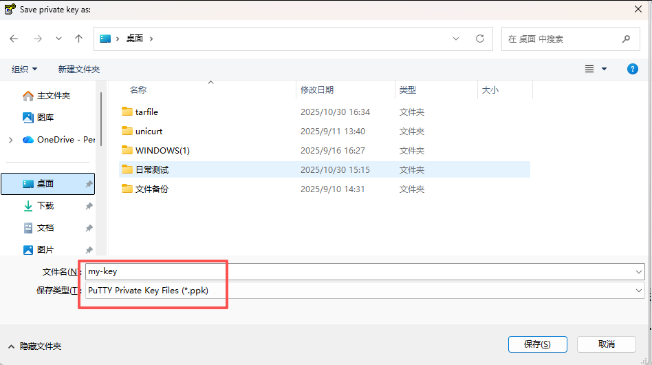 上面操作完成后,回到Puttygen,把生成的KEY保存成文件,用于Putty的key