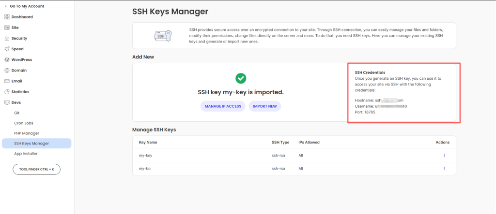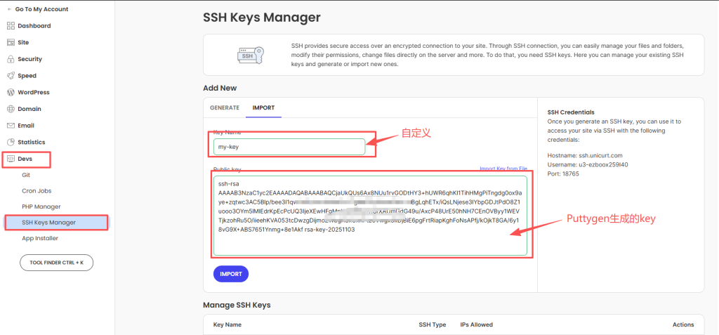我们来到siteground的后台SSH的位置,导入KEY后保存