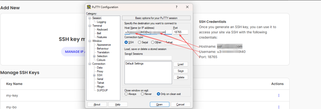 OK,上面的操作完成后,我们就可以打开Putty.exe,开始连接SSH了,先打开siteground SSH的右边获取地址和账号,端口号