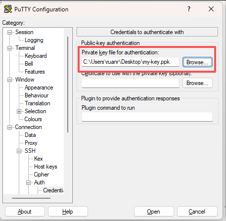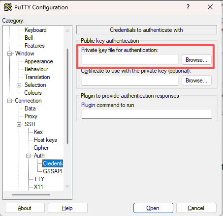 打开Connection -> SSH -> Auth -> Credentials 有些Putty工具在Auth就可以导入