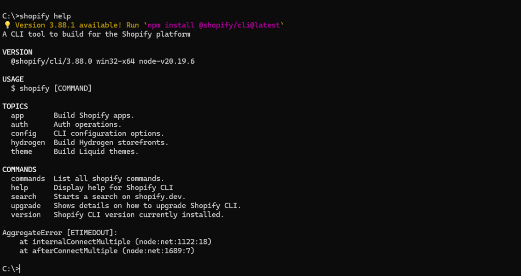 Shopify CLI 将命令按主题分组。命令语法为:shopify [topic] [command]。请参阅侧边栏中每个主题部分,查看可用命令列表。