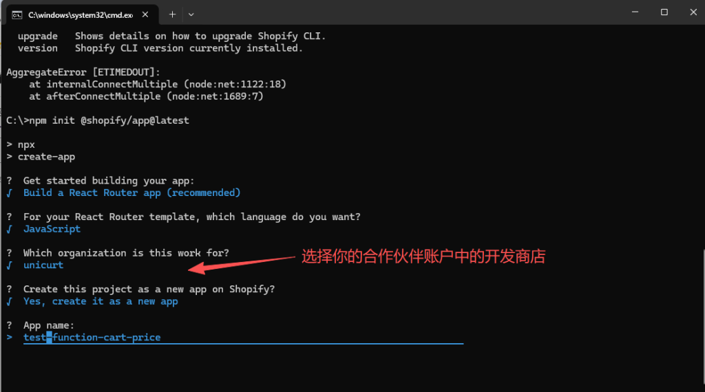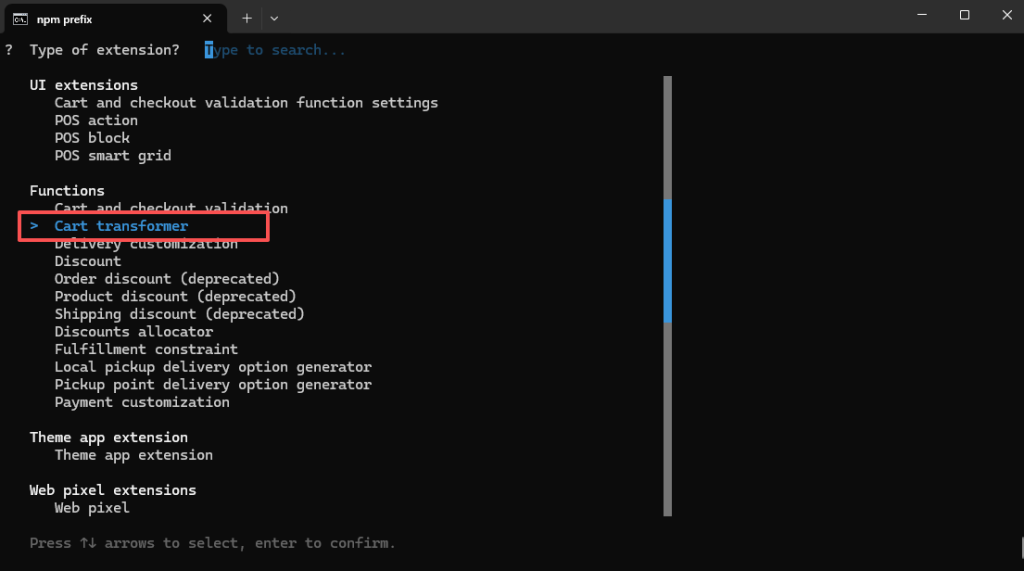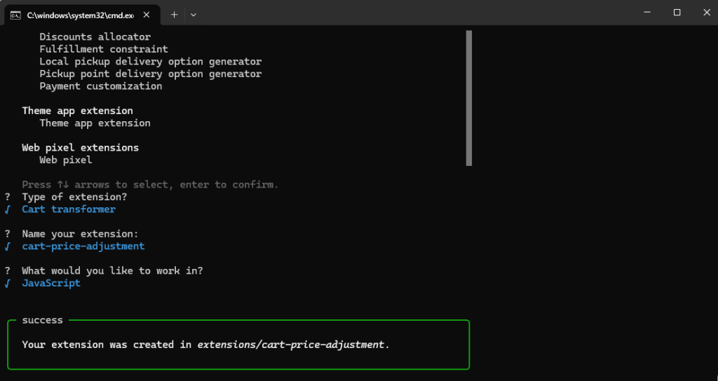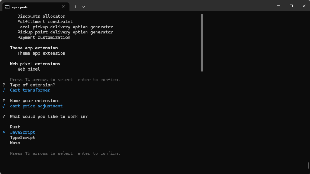 3.生成 Cart Transform Extension,这里是生成Function的重要步骤,选择你要使用的函数,我的需求要更改覆盖价格,所以我选择Cart Transform函数,每个函数对应一个文件夹,所以要创建对应的文件夹,代码选择JS,你也可以选择其他的