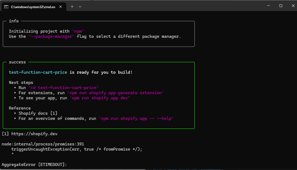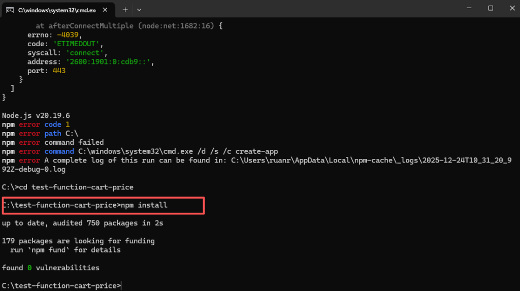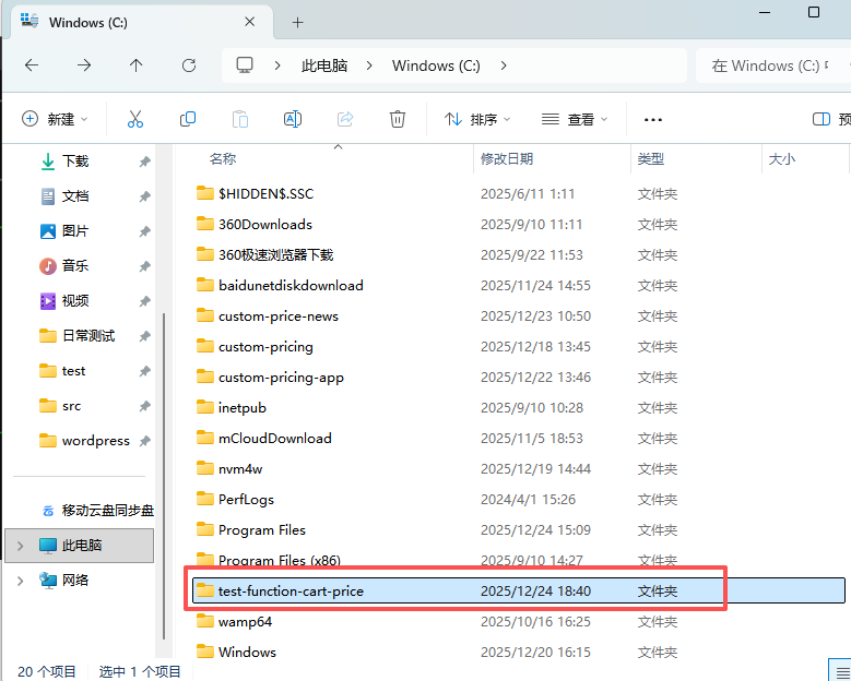 提示完成,这时你打开你的文件夹中会出现一个test-function-cart-price的文件夹,我这里是C盘